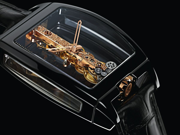 長形機(jī)芯置于黑色陶瓷表殼內(nèi),表面、表背及兩側(cè)由藍(lán)寶石水晶玻璃制成,360度透視出直線式 機(jī)芯結(jié)構(gòu),讓人陶醉于迷人的透明藝術(shù)之中。設(shè)于上層的夾板橋由5N18K