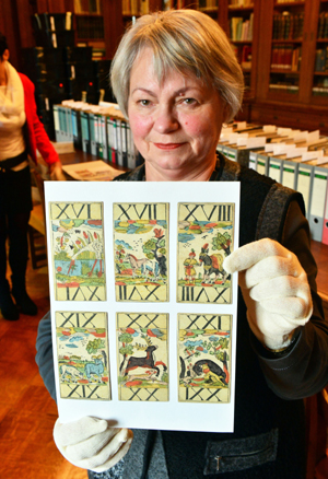 1月16日,德國(guó)阿爾滕堡撲克牌博物館重金收購(gòu)某私人收藏的約2000副撲克牌,其中部分傳自16、18世紀(jì)和19世紀(jì)初期。圖為撲克牌專家雷娜特·賴因霍爾德展示一副大約1700年的動(dòng)物塔羅牌。
