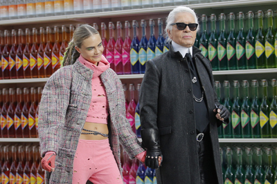 在巴黎時(shí)裝周應(yīng)接不暇的各大品牌發(fā)布會(huì)中,香奈兒的秀場總是別出心裁獨(dú)樹一幟。今年,著名設(shè)計(jì)師卡爾·拉格費(fèi)爾德將位于巴黎大展覽館(又名大皇宮)的秀場變身為一個(gè)“大超市”,模特們身著新款成衣穿行其中,別有一番趣味。圖為卡爾·拉格費(fèi)爾德(右)與模特卡拉·德萊文涅在時(shí)裝秀結(jié)束時(shí)向觀眾致意。