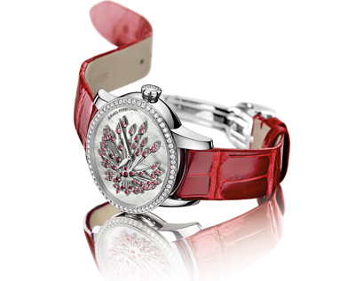 黑色人手打磨縞瑪瑙表盤上鑲73顆圓鉆;白色珍珠貝母表盤微微染灰并鑲73顆粉紅/紅色藍(lán)寶石,后者挑選極為嚴(yán)格,以達(dá)到悅目漸變色效果;兩款設(shè)計(jì)裝配微拱葉形指針,突顯其線條份量及金屬質(zhì)感。