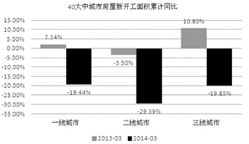 我們從上述數(shù)據(jù)可以看出:房地產(chǎn)市場成交量大幅回落,而房地產(chǎn)開發(fā)商的激情與成交量息息相關(guān)。2013年全國40個大中城市一線,二線城市同比出現(xiàn)小幅下降,三線城市略微上漲,這也和國內(nèi)具體主要城市的房屋新開工面積在2013年漲跌相吻合。當(dāng)時間進(jìn)入到2014年后除了河北石家莊因前期的京津冀一體化政策的影響,新開工面積出現(xiàn)大幅上漲外,其他40個大中城市和國內(nèi)具體主要大城市新開工面積同比全部出現(xiàn)大幅下降,尤其是二線城市降幅更大,因此二線城市地產(chǎn)市場壓力可能會更大一些。