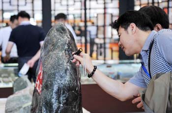 在2014哈爾濱國際珠寶玉石博覽會上,一位參會客商在查看一塊俄玉原石。記者 王建威