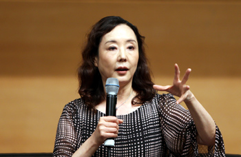 著名作家嚴歌苓在香港書展“名作家講座系列”上演講。記者 李鵬/攝 |