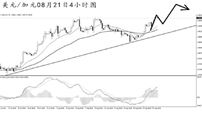 美元兌加元短線發(fā)起上攻。從4小時圖上看,MACD已經(jīng)進(jìn)入到多頭動能充盈的階段,均線系統(tǒng)重新形成向上的排列,匯價繼續(xù)上攻的概率偏大。短線面臨一定的下行壓力,但仍可保持看漲的思路。