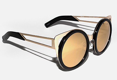 充滿女性魅力的金屬貓眼鏡框搭配黑色纖柔鏡腿,金色鏡片與同色金屬鏡框交相輝映,在不同光線下呈現(xiàn)微妙變幻迷人光彩。
