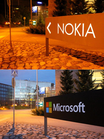 諾基亞2014年4月25日宣布完成向微軟出售手機(jī)業(yè)務(wù)部門(mén)。拍攝于2013年9月8日,位于芬蘭埃斯波的諾基亞總部;下圖拍攝于2014年4月26日,位于芬蘭埃斯波市的原諾基亞總部已更換微軟標(biāo)志。記者 李驥志/攝 |
