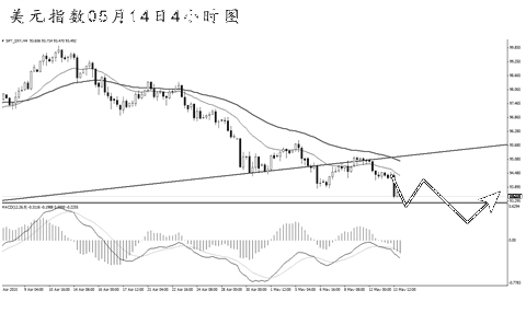 美元指數(shù)未能重新升破上升趨勢(shì)線的阻力,短線繼續(xù)下行回落。從日線圖上看,下方道氏低點(diǎn)支撐在93.20,美元指數(shù)即將向此位置發(fā)起沖擊。MACD顯示空頭動(dòng)能仍然強(qiáng)勁。從4小時(shí)圖上看,美元指數(shù)主趨勢(shì)向下,均線系統(tǒng)保持完好的壓制排列。短線的下跌力度較強(qiáng),目前面臨一定的上調(diào)壓力,但后市延續(xù)跌勢(shì)的概率較大。
