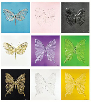 達(dá)米恩·赫斯特:我視蝴蝶為靈魂,也是廣泛被使用的世界視覺語言。我經(jīng)常形容蝴蝶是宇宙的啟發(fā)者,每一個人都會愛上它那不可思議的脆弱美態(tài)。對我來說,蝴蝶另一個吸引的元素,就是那種介乎于生日賀卡上被大眾喜愛的形象、愛的力量,以及昆蟲本身真實存在的矛盾張力。我們往往嘗試?yán)米匀粊肀磉_(dá)一些難以言傳的意念:愛、欲望、信念和永恒,蝴蝶正好是一個有趣的例子。其實這些都是既定的意念,基督教便經(jīng)常利用蝴蝶來表現(xiàn)復(fù)活;古希臘用來代表靈魂。我最喜愛蝴蝶無論生前死后都是一模一樣,但當(dāng)光線穿透這些版畫時,它們就像以另一種形態(tài)復(fù)活了。