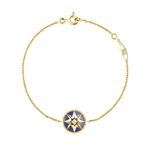 Vents(羅盤玫瑰)系列正是基于這些故事的靈感之作!拔易畛踉O(shè)想的是一枚小小的圖案吊墜,后來我覺得設(shè)計(jì)成圓形圖案的徽章樣式更具紀(jì)念意義!边@位迪奧高級(jí)珠寶部藝術(shù)總監(jiān)如是說!八笳髀眯校渲刑N(yùn)含著克里斯汀·迪奧的星星和那段幸運(yùn)符的故事,同時(shí)包含了迪奧先生最愛的玫瑰花元素。品牌的歷史精髓都隱含在其中!庇牲S金和珍珠母貝、青金石或綠松石、玫瑰金和粉色蛋白石精心打造,這些美輪美奐的珠寶仿佛在輕訴品牌的傳奇故事。圓形徽章圖案周圍飾有一圈金色稻穗,旨在向帆纜和大海致敬。吊墜一面為寶石,一面為羅盤玫瑰圖案,正反面隨著佩戴者的舉手投足交替顯現(xiàn)。圍繞同主題打造的手鏈和長(zhǎng)短款項(xiàng)鏈,大大豐富了這一系列的選擇。“Rose