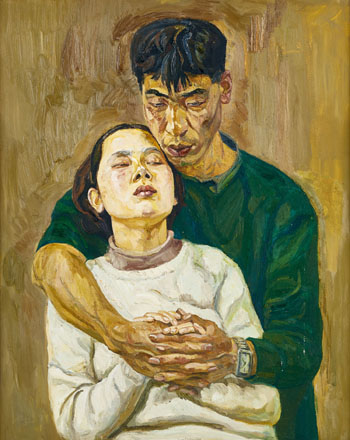 九十年代初,劉小東創(chuàng)作了一系列以身邊朋友為模特兒的「愛(ài)情」題材作品,真實(shí)地記錄了八十年代末到九十年代初情人們熱戀的心理歷程,以及中國(guó)社會(huì)和文化在轉(zhuǎn)型時(shí)期的豐富性。1991年作的《纏綿》是這階段的代表作之一。整幅畫(huà)面的構(gòu)圖被一對(duì)擁抱在一起的戀人占據(jù),沒(méi)有多余的情節(jié)與縫隙。徹底脫離了宏大敘事的劉小東,癡迷地表述普通人的真實(shí),個(gè)體的價(jià)值在他的繪畫(huà)中被大大提升。