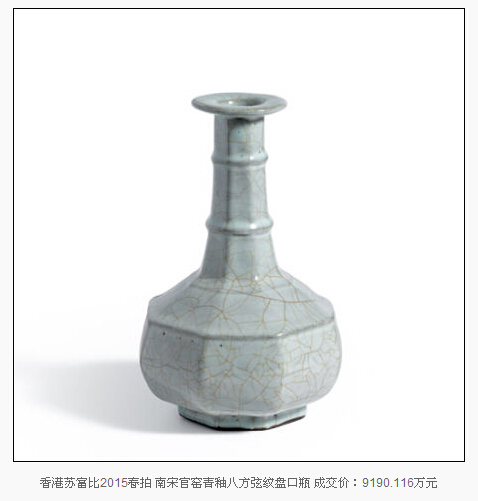 2015年已經(jīng)過(guò)半,藝術(shù)市場(chǎng)上各大拍行春拍也相繼收槌。瓷器板塊,香港蘇富比春拍一件南宋官窯青釉八方弦紋盤口瓶以1億1388萬(wàn)港元(約合9190萬(wàn)人民幣)的成交價(jià)占據(jù)2015上半年的排行榜頭名,這一價(jià)格也成為宋代瓷器歷史第三高拍賣成交價(jià)。高古瓷器的市場(chǎng)走高也被相當(dāng)一部分業(yè)內(nèi)人士認(rèn)為是古瓷市場(chǎng)回歸理性的征兆。