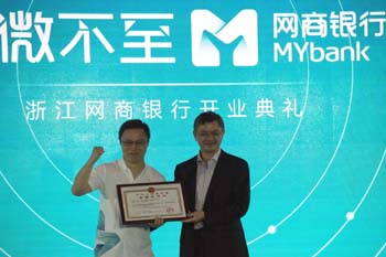 6月25日,網(wǎng)商銀行董事長井賢棟(左)在開業(yè)儀式上獲頒中華人民共和國金融許可證。記者 鞠煥宗 攝 |