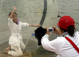 5月7日,在哈爾濱太陽島風(fēng)景區(qū),一位母親在給水球中的孩子拍照。 當(dāng)日是“五一”黃金周的最后一天,許多冰城市民在市區(qū)公園內(nèi)盡享長(zhǎng)假快樂。新華社記者:王建威