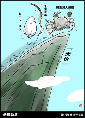 今秋,媒體報道江蘇陽澄湖大閘蟹運至北京超市,賣到了328元/斤;在冬蟲夏草的產(chǎn)地青海,目前一公斤上等冬蟲夏草,價格已升至20萬元,每克價格超過黃金;新疆和田玉中仔玉目前以克論價,精品每克高達數(shù)萬元,真正演繹“瘋狂的石頭”…… 冬蟲夏草在我國,特別是臺灣、香港、澳門地區(qū)以及東亞、南亞、西亞20多個國家及世界五大洲華人中具有廣闊的市場。由于目前科學界尚未研究清楚冬蟲夏草的形成機制,到目前它還不能進行人工規(guī);a(chǎn)。 近年冬蟲夏草價格飛漲,青海等原產(chǎn)地的售價與30年前比較已經(jīng)上漲千倍以上。長年研究冬蟲夏草的中國科學院西雙版納熱帶植物園研究員、博士生導師楊大榮告訴記者,20世紀50年代以前全國年產(chǎn)量曾達100噸以上,60年代初為50噸至80噸,到20世紀90年代僅有五噸至15噸。其價格在1980年為200元一公斤,而現(xiàn)在最高價已經(jīng)達28萬元一公斤。 西寧市七一路一家蟲草專賣店的王經(jīng)理告訴記者,目前經(jīng)營蟲草非理性因素已經(jīng)比較明顯。一些東部商人帶著上億資金到青海來收購蟲草,蟲草在冰柜里“捂”上一年,至少會有50%的利潤。蟲草資源有限,未來價格還會大幅上漲。 頻頻刷新的“天價”,折射市場的無序。大閘蟹在國內(nèi)并不稀缺,利用廣告陽澄湖大閘蟹成為名牌后,商家利用名牌掛出普通百姓難以承受的“天價”,大發(fā)橫財;商家開發(fā)蟲草保健品,其功效被說得神乎其神:從抗癌到壯陽,從美容到治療艾滋病,幾乎無所不能,蟲草成了包治百病的“神藥”;在收藏升值概念誤導下,炒玉和炒股沒有區(qū)別,玉商間的抬價,最后使天價“寶玉”到了消費者的手中……商業(yè)炒作,一些不負責任的媒介也充當了幫兇。