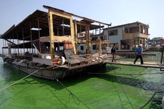 工人們?cè)诓鸪罱ㄔ谔械臒o錫太湖馬山水上餐廳建筑群。本報(bào)資料照片 | 資源環(huán)境壓力迫使東部產(chǎn)業(yè)轉(zhuǎn)移加速