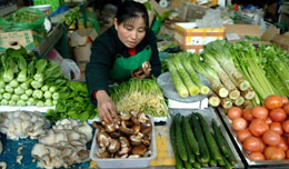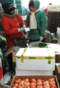 1月20日,在大連一蔬菜批發(fā)市場,一采購者與批發(fā)經(jīng)營者談價格。為抑制蔬菜價格上揚,保障節(jié)日市場供應,大連市從1月15日起對進入雙興、金三角和南關嶺三大蔬菜批發(fā)市場經(jīng)營芹菜、黃瓜等13種蔬菜的商戶實行補貼。經(jīng)過五天的運行,市場零售價開始回落,效果明顯。新華社發(fā)(劉德斌攝) | 山東糧農(nóng)歡喜菜農(nóng)憂