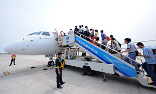6月5日,旅客在天津濱海國際機場登上準備飛往大連的E190客機。據(jù)介紹,E190客機是先進的高性能噴氣式客機,可提供106個座位。新華社記者
