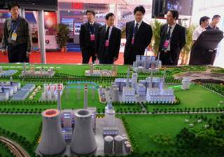 在太原舉辦的第二屆中國國際煤炭與能源新產(chǎn)業(yè)博覽會(huì)上,煤氣化、煤化工、新能源等循環(huán)經(jīng)濟(jì)項(xiàng)目在會(huì)展上成為一大亮點(diǎn),備受人們關(guān)注。圖為客商在參觀中電集團(tuán)區(qū)域循環(huán)經(jīng)濟(jì)的示范沙盤。新華社記者
