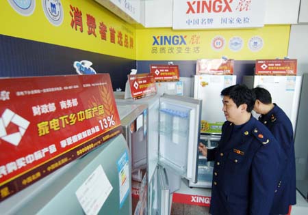自2008年12月湖南省正式啟動家電下鄉(xiāng)工程以來,受到了全省農(nóng)村消費者的青睞,各類家電銷售態(tài)勢良好。目前,湖南省14個市州已經(jīng)設立了5400家家電下鄉(xiāng)銷售網(wǎng)點。圖為湖南省長沙縣路口鎮(zhèn)村民正在一家“家電下鄉(xiāng)指定店”選購家電產(chǎn)品。新華社記者:龍弘濤