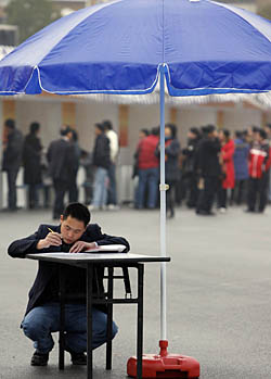 農(nóng)民工職介專場(chǎng)招聘會(huì)上,求職者在現(xiàn)場(chǎng)填寫表格。新華社記者 劉穎