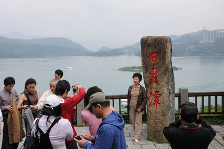一群來自上海的游客在臺灣“日月潭”字碑前排隊(duì)留影。新華社記者 余福卿 攝 |