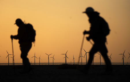 5月19日清晨,甘肅酒泉市瓜州縣的戈壁灘上,兩名戶外運(yùn)動(dòng)愛(ài)好者徒步走過(guò)的朝陽(yáng)映照下的風(fēng)力發(fā)電機(jī)。