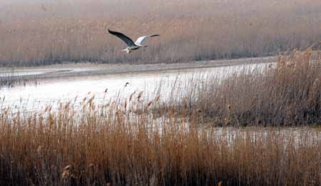 鳥兒在黃河三角洲濕地上飛翔。新華社記者:范長國/攝 |