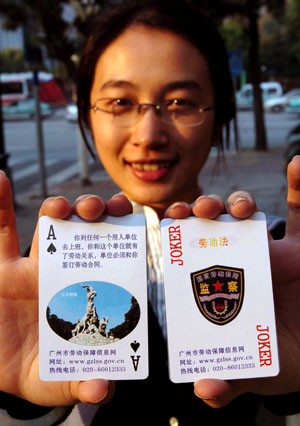 當日起,廣東省廣州市勞動保障局將印有《勞動法》內容的8萬副撲克牌陸續(xù)發(fā)放給轄區(qū)內的農民工。