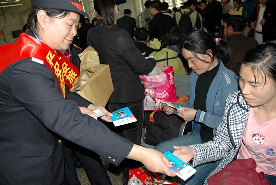 1月8日,廣州火車站工作人員在候車室向返鄉(xiāng)的外來工發(fā)放宣傳勞動法規(guī)的小冊子,方便外來工在旅途中學習。