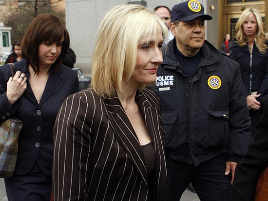 4月14日,在美國紐約,小說《哈利·波特》作者J·K·羅琳(前)向法庭陳述后離開。當日,羅琳與一名美國“哈利·波特”迷對簿公堂。羅琳認為,這名“粉絲”打算出版的《哈利·波特詞典》侵犯了她的知識產(chǎn)權。新華社/路透