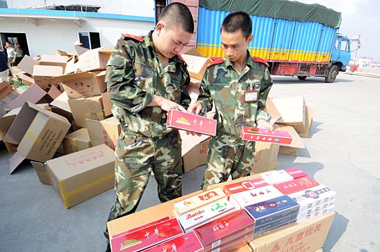 10月21日上午,深圳邊防支隊鹽田邊防工作站官兵在深圳機(jī)荷高速公路平湖出口處查獲一起涉嫌走私名牌香煙案,當(dāng)場查獲無合法手續(xù)的中華、紅塔山、紅雙喜等名牌香煙近1000箱,涉案金額約400萬元。