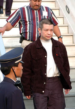 2004年4月16日,犯罪嫌疑人、原中國銀行廣東省開平支行行長余振東被美國警方押送回北京首都國際機(jī)場時走下飛機(jī)。新華社記者 袁滿
