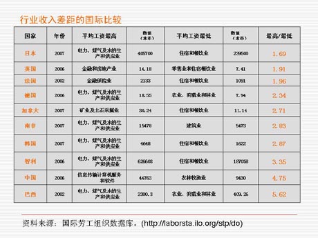 與國際相比,日本最高比值是1.69倍,英國是1.91倍,法國1.96倍,德國2.23倍,加拿大2.71倍,巴西比較高是5.62倍。我們總是擔(dān)心中國陷入拉美式的經(jīng)濟(jì)陷阱,然而,根據(jù)國家統(tǒng)計(jì)局發(fā)布的今年第一季度最新行業(yè)平均工資數(shù)據(jù),可以計(jì)算出我國收入最高的行業(yè)是證券業(yè),是全國平均水平的5.9倍,金融業(yè)是平均工資的3倍。而較低的木材加工業(yè)只有全國平均水平的53.6%,紡織業(yè)是全國平均水平的55.5%,農(nóng)副產(chǎn)品是60.1%,最高與最低行業(yè)平均工資之比是11比1,遠(yuǎn)遠(yuǎn)超過巴西。