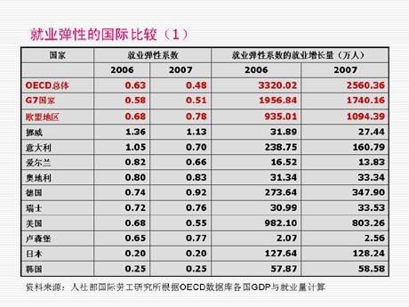 再和國際上進(jìn)行比較,根據(jù)人力資源和社會保障部國際勞工研究所對OECD數(shù)據(jù)庫和各國GDP就業(yè)量的計(jì)算,一般發(fā)展中國家就業(yè)彈性平均在0.3-0.4,發(fā)達(dá)國家2007年歐盟地區(qū)總就業(yè)彈性是0.78,OECD國家是0.48。這說明我們這種經(jīng)濟(jì)增長方式對帶動就業(yè)的促進(jìn)作用,與發(fā)達(dá)國家相比差太多了,中國基本上是全世界就業(yè)彈性最低的國家。