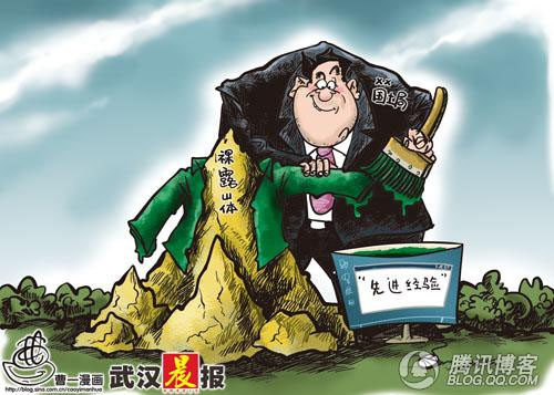 秦嶺在陜西省華縣境內(nèi)的山體被亂采亂挖,當?shù)貫檠陲,用藍色圍欄遮擋采石場,還將山體裸露的石壁用油漆刷成綠色。當?shù)毓賳T稱,此舉是國內(nèi)最先進的經(jīng)驗,從網(wǎng)上找的。(9月2日《南方都市報》)