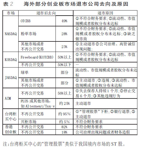 在排序上有所不同在不同的創(chuàng)業(yè)板市場,其上市公司被強制退市的原因在排序上存在如下差異: 1.在NASDAQ,因股價、流動性和市值未達標而退市的公司較多。在NASDAQ,因公司治理、信息披露和財務造假等原因而退市的公司比例為1.9%,遠低于因股價、流動性和市值規(guī)模未達標而被退市的公司數(shù)量。這表明在發(fā)展相對完善的創(chuàng)業(yè)板市場,退市更多的是市場主體對公司素質的甄別,而不是監(jiān)管機構對公司違紀行為的判斷。美國證券市場長期發(fā)展形成的市場文化和道德規(guī)范,保證了退市制度對上市公司行為的約束。 2.在香港創(chuàng)業(yè)板、韓國KOSDAQ、臺灣柜買中心,經(jīng)營業(yè)績不達標和違規(guī)行為是公司退市的重要原因。在香港創(chuàng)業(yè)板,截至目前的16家被強制退市的公司中,13家公司因經(jīng)營業(yè)績不達標、3家公司因違規(guī)行為而退市。例如,長春達興、迪斯數(shù)碼等皆因無法及時公告公司年度業(yè)績報告并最終退市;又如,艾克國際在為期兩年的強制保薦期結束不久即發(fā)生了高管集體失蹤事件;數(shù)碼庫上市不足半年,就發(fā)生高管卷款失蹤事件,這兩家公司在長期停牌后均被退市。 在KOSDAQ,三成左右的退市公司與停止營業(yè)活動、破產(chǎn)和被出示非標準無保留意見審計報告有關。在臺灣柜買中心,“因存款不足而有銀行退票記錄”是重要的退市原因,約占下柜公司總數(shù)的三分之一。 (三)不同創(chuàng)業(yè)板市場退市公司的去向不同 1.創(chuàng)業(yè)板上市公司的退市去向主要有場外市場、不再公開交易等,但不同市場間的差別較大。如表2所示,美國NASDAQ和韓國KOSDAQ的公司大多退往低層次的場外交易市場;而日本JASDAQ和英國AIM則有部分公司退至場外市場;臺灣柜買中心和香港創(chuàng)業(yè)板的多數(shù)退市公司不再公開交易。