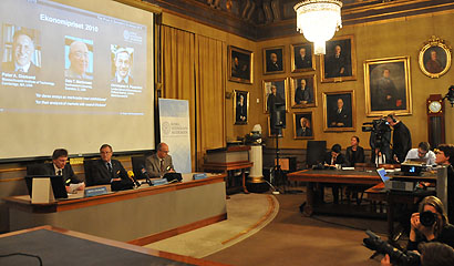 2010年10月11日,瑞典皇家科學(xué)院宣布,美國經(jīng)濟(jì)學(xué)家彼得·戴蒙德和戴爾·莫頓森,以及具有英國和塞浦路斯雙重國籍的經(jīng)濟(jì)學(xué)家克里斯托弗·皮薩里德斯將分享2010年諾貝爾經(jīng)濟(jì)學(xué)獎(jiǎng)。瑞典皇家科學(xué)院當(dāng)天說,這三名經(jīng)濟(jì)學(xué)家憑借對“經(jīng)濟(jì)政策如何影響失業(yè)率”理論的進(jìn)一步分析,摘得2010年諾貝爾經(jīng)濟(jì)學(xué)獎(jiǎng)桂冠。三人的理論可以解釋許多經(jīng)濟(jì)現(xiàn)象,包括“為何存在很多職位空缺的時(shí)候,仍有眾多人失業(yè)”。三人建立的經(jīng)濟(jì)模型還有助于人們理解“規(guī)章制度和經(jīng)濟(jì)政策如何影響失業(yè)率、職位空缺和工資”。新華社記者 吳平 攝