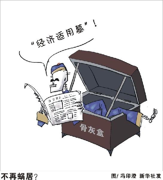 近年來,全國各地不斷曝出“天價墓”“豪華墓”,一些墓地動輒幾十萬元,有的甚至上百萬元,比不斷上漲的房價還高,被輿論批為“黃泉路上收費(fèi)高”。最近,浙江省寧波市北侖區(qū)推出的“經(jīng)濟(jì)適用墓”,再次掀起有關(guān)殯葬改革的輿論交鋒:墓價高于房價,“經(jīng)濟(jì)適用墓”能否破解“黃泉路上收費(fèi)高”的尷尬,減輕群眾的殯葬負(fù)擔(dān)?這種改革是否適合我國人多地少的國情,符合殯葬改革的方向?相關(guān)人士認(rèn)為,傳統(tǒng)觀念在短期內(nèi)很難改變,應(yīng)當(dāng)正視群眾“入土為安”的殯葬需求,允許作為權(quán)宜之計的“經(jīng)濟(jì)適用墓”嘗試和探索。但更為長遠(yuǎn)的,應(yīng)當(dāng)理順殯葬管理體制,加快殯葬管理立法進(jìn)度,積極推行政事分開、管辦分離,通過政府限價等干預(yù)措施,讓墓價整體“經(jīng)濟(jì)適用”。新華社發(fā)