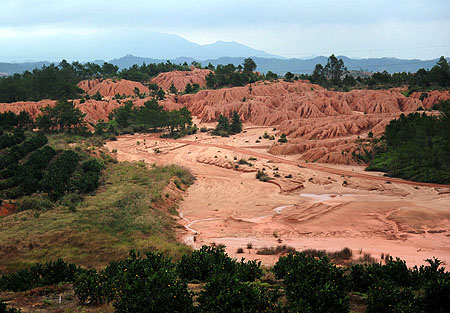 稀土開發(fā)留下的尾砂山 在江西省信豐縣水土保持教育基地,因稀土開發(fā)留下的寸草不長的尾砂山和周圍綠意蔥蘢的橙園形成對比(10月24日攝)。上世紀80年代,這里的稀土礦區(qū)新增水土流失面積24.68平方公里,排放尾砂近6000萬噸,尾砂山成了“江南沙漠”! ∮浾