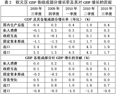 發(fā)達經濟體被迫改變負債消費模式。長期以來,以美國為首的發(fā)達國家主要靠消費來拉動經濟增長。其中,美國個人消費支出占經濟總量的2/3以上。今后這種基本格局雖然不會改變,但以住房次級按揭貸款形式為標志的負債消費和過度消費模式已經難以為繼。美國消費信貸2010年連續(xù)7個月放緩,美國民眾的消費習慣有所改變,傾向于更為謹慎。在歐元區(qū),長期居高不下的失業(yè)率和人口老齡化加劇了居民消費的低迷。而且,歐元區(qū)各國為了遏制主權債務危機所采取的財政緊縮政策,如增加稅收、減少補貼等,又對居民消費產生明顯的抑制作用。在日本,2010年前三季度的數(shù)據表明,民間最終消費的增長速度低于民間企業(yè)投資和貨物勞務出口的增長速度,居民消費仍然疲軟。在消費不振的情況下,發(fā)達經濟體的緩慢復蘇更多得益于投資與出口。美國采取量化寬松的貨幣政策,促使美元貶值,加上奧巴馬政府提出的“再工業(yè)化”和“出口倍增計劃”,一定程度上刺激了經濟恢復并弱化了經濟增長對消費拉動的依賴。從表1可以看出,2010年前三季度,美國個人消費的增長速度都低于私人國內投資和出口。從表2可以看出,2010年上半年特別是二季度,歐元區(qū)經濟加速復蘇主要得益于出口的迅速恢復。日本的情況也是如此。
