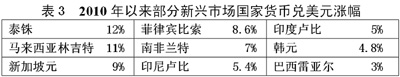 美國量化寬松貨幣政策導致美元貶值,人民幣升值壓力增大。從2010年8月以來,美國已經啟動兩輪量化寬松貨幣政策,并開始醞釀2011年的寬松貨幣政策。這導致美元對日元等西方貨幣一路下跌,并使許多發(fā)展中國家貨幣對美元大幅度升值(見表3)。2010年以來,人民幣對美元匯率升值幅度已接近3%。人民幣匯率上升,使我國出口貿易企業(yè)經營困難,貿易順差呈下降趨勢。在這種情況下,堅持擴大內需更具有現(xiàn)實意義。