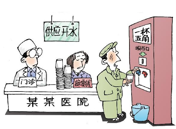 最近,昆明市部分醫(yī)院“賣開水”現(xiàn)象引起關(guān)注,此舉被一些院方解釋為“遏制浪費(fèi)”“杜絕資產(chǎn)流失”,但患者不樂意了,“我來(lái)你這兒看病,喝杯開水還要掏錢?”究竟是遏制浪費(fèi),還是另有企圖?醫(yī)療機(jī)構(gòu)“賣開水”背后,其實(shí)暗藏公益行為與公眾素質(zhì)之間的對(duì)壘。記者在昆明市兒童醫(yī)院調(diào)查發(fā)現(xiàn),門診大廳、住院部都設(shè)置了投幣式開水器,患者要喝一杯600毫升左右的開水,必須投幣5角;為“方便”患者投幣,大廳一側(cè)的小賣部還專設(shè)了硬幣兌換點(diǎn)。常帶孩子來(lái)就診的陳女士反映,兒童醫(yī)院的換幣買水現(xiàn)象已經(jīng)持續(xù)很長(zhǎng)時(shí)間了,“醫(yī)院真是掉錢眼里了,怎么能這樣對(duì)待患者呢?作為公共服務(wù)機(jī)構(gòu),醫(yī)院應(yīng)該像機(jī)場(chǎng)、車站一樣,免費(fèi)提供飲用水!”