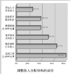 關(guān)于怎樣調(diào)整收入分配結(jié)構(gòu)?78.7%的領(lǐng)導(dǎo)干部建議“改善勞資關(guān)系,著力提高工資在GDP中的比重”。63.9%的領(lǐng)導(dǎo)干部建議應(yīng)該“規(guī)范壟斷行業(yè)收入,對國有企業(yè)進(jìn)行‘分紅收租’”,表明壟斷行業(yè)職工收入過高是已成為收入改革必須攻克的堡壘。50.9%的領(lǐng)導(dǎo)干部認(rèn)為要“切實提高農(nóng)民收入”。38.9%的領(lǐng)導(dǎo)干部認(rèn)為應(yīng)“明顯降低財政在GDP中的比重,降低行政成本”,政府應(yīng)該讓民眾更多地分享經(jīng)濟(jì)發(fā)展的成果。38.9%的領(lǐng)導(dǎo)干部認(rèn)為要“改善就業(yè)環(huán)境,增加就業(yè)機(jī)會”,表明就業(yè)是增加低收入者收入的有效途經(jīng)。25.9%的領(lǐng)導(dǎo)干部認(rèn)為要“加大人力資本投入,使勞動者作為財富創(chuàng)造者的能力普遍提升”,表明通過教育加大人力資本投入,可以為未來縮小收入差距奠定基礎(chǔ),但對當(dāng)前的影響不是很大。