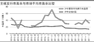 圖三:滬市發(fā)行市盈率與市場平均市盈率比較