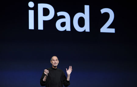 iPad的新款又推出了,但中國(guó)的iPad的商標(biāo)權(quán)并不在蘋(píng)果之手。 圖為2011年3月2日,蘋(píng)果公司首席執(zhí)行官史蒂夫·喬布斯在美國(guó)舊金山舉行的新產(chǎn)品發(fā)布會(huì)上介紹iPad2。當(dāng)天,美國(guó)蘋(píng)果公司推出新一代平板電腦iPad2。 資料照片 |