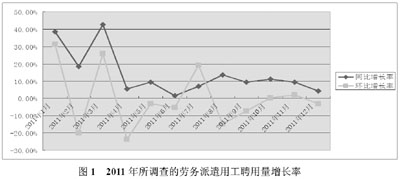 1.與上年同期相比,2011年所調(diào)查的勞務(wù)派遣用工聘用量有明顯的增長,但增速有小幅下滑。