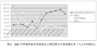 一是,與上年同期相比,所調(diào)查的勞務(wù)派遣用工聘用量增長明顯,但增速有小幅下降;此增長在行業(yè)和城市之間不均衡。