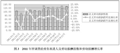 2011年所調(diào)查的勞務(wù)派遣人員的勞動(dòng)報(bào)酬水平逐步提高。