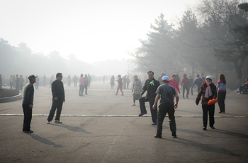 實施好新的《環(huán)境保護法》,可以給我們的生活帶來一縷吹散霧霾的清風。圖為長春市民在春天的霧霾中踢毽子。記者