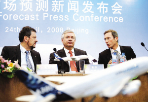 4月24日,空中客車公司客戶事務(wù)首席運(yùn)營官雷義(中)、空中客車公司市場預(yù)測與研究副總裁勞倫·羅奧(右)和空中客車中國公司總裁博龍?jiān)?007—2026年全球航空市場(中國)預(yù)測發(fā)布會(huì)上。